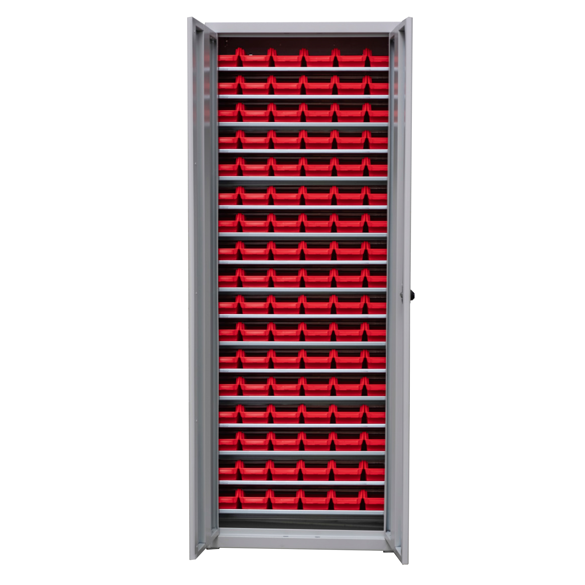 Celozváraná kovová skriňa na plastové boxy a vaničky, 14-policová z oceľového plechu (0,7 – 1,5 mm) je pevné a uzamykateľné riešenie na bezpečné uloženie dielov, náradia, spojovcieho materíálu . Uzamykateľný mechanizmus chráni obsah pred neoprávneným prístupom, čo oceníte v administratívnych a firemných priestoroch.